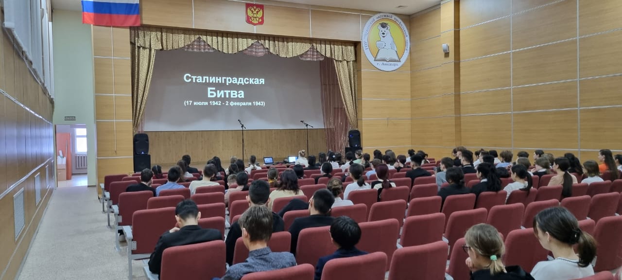 2 февраля 2023 года, в день 80-й годовщины победы в Сталинградской битве в актовом зале Чукотского окружного профильного лицея для обучающихся 8-11 классов прошла линейка, посвященная событию, положившему начало коренного перелома в Великой Отечественной войне. Цель мероприятия - воспитание чувства патриотизма, любви к Родине, чувство гордости за свою страну, повышение интереса к истории нашей страны. В этот день отмечается 80 лет со дня окончания Сталинградской битвы, ставшей переломным моментом в ходе Великой Отечественной войны и продемонстрировавшей всему миру несгибаемую силу духа, мужество и героизм советских войск.