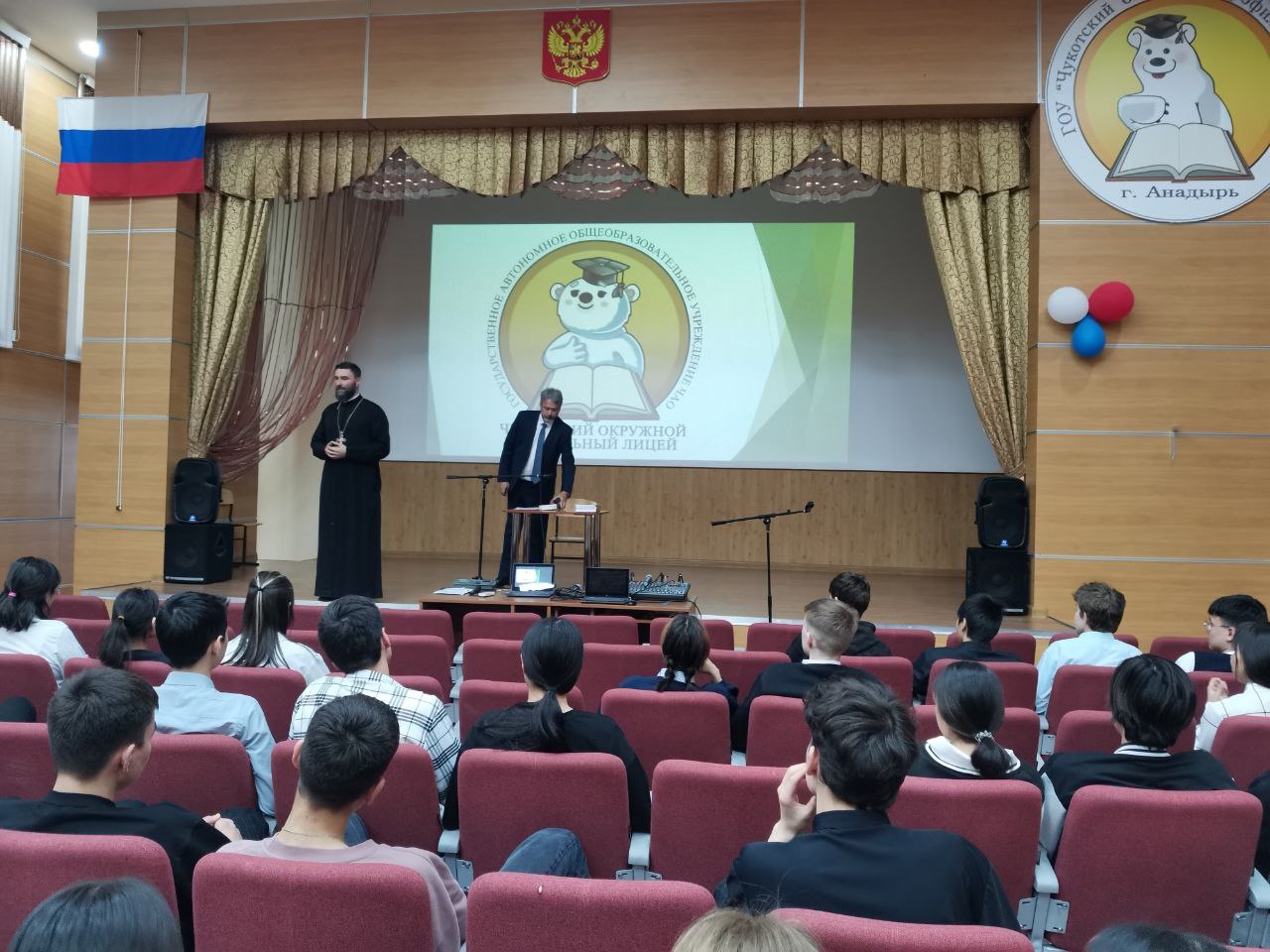 17 мая состоялась встреча обучающихся лицея с преподавателем Российского Православного Университета (г. Москва) и Перервенской православной духовной семинарии (г. Москва) Солодковым А. И. Беседа прошла в рамках программы «Духовная безопасность России» при активном содействии Анадырской и Чукотской епархии. Андрей Иванович в ходе встречи затронул различные аспекты взаимоотношений современной науки и христианского мировоззрения. Духовная безопасность – одна из актуальных проблем нашего времени, одна из главнейших для человека, семьи и напрямую имеет отношение к самореализации личности.
