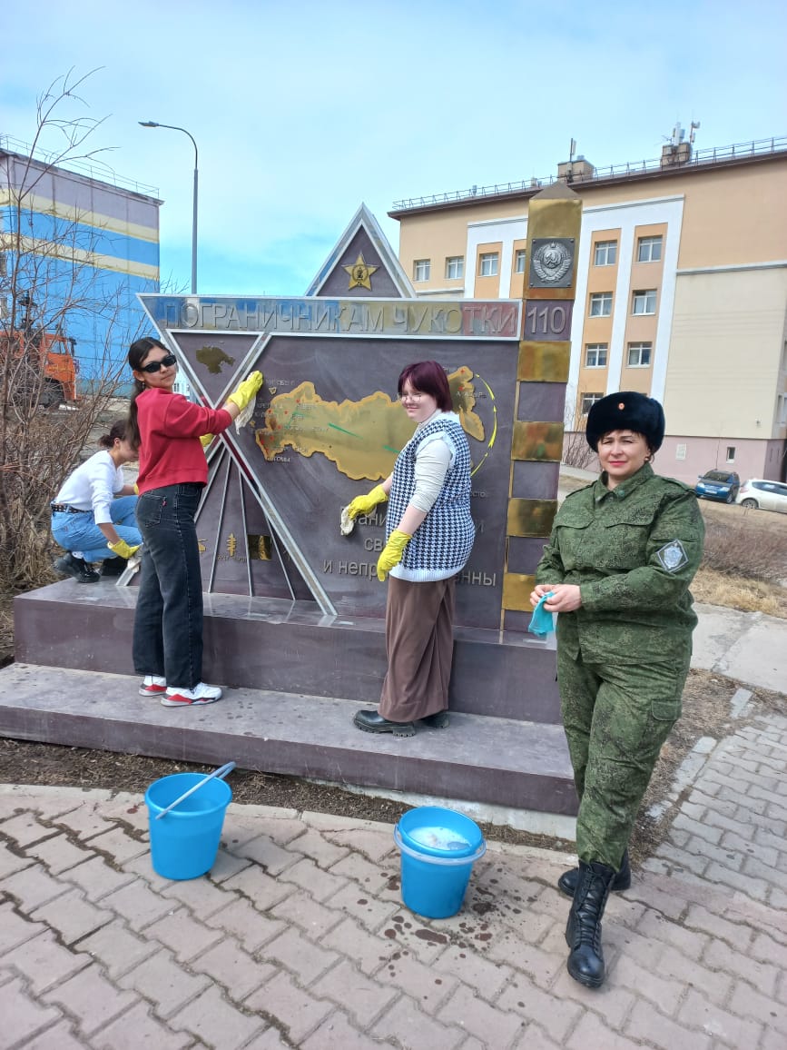 Наши учащиеся второй год шефствуют над памятным знаком «Пограничникам Чукотки». Вместе с сотрудниками погранслужбы ребята привели в порядок знак и территорию вокруг него. И еще раз вспомнили историю создания пограничной службы на Чукотке.