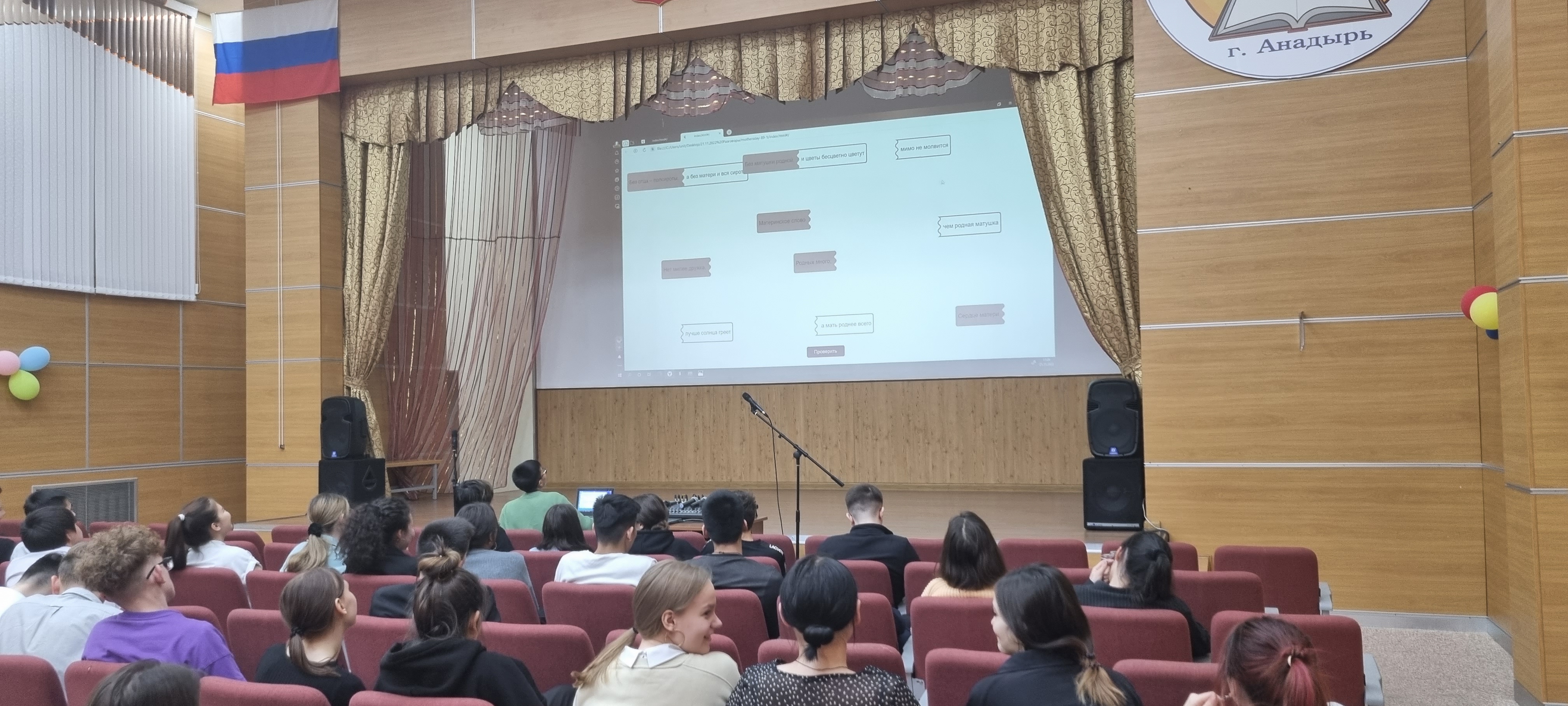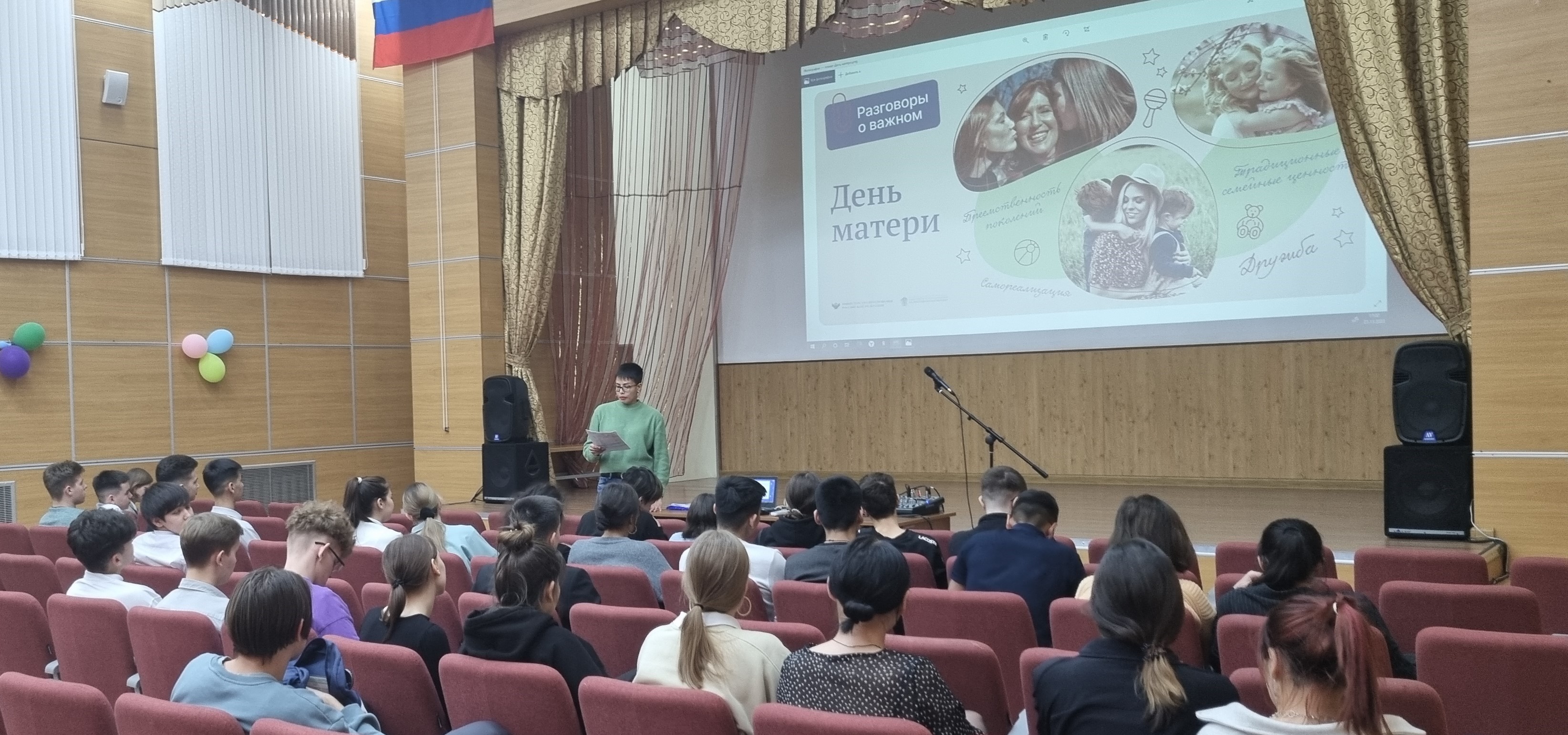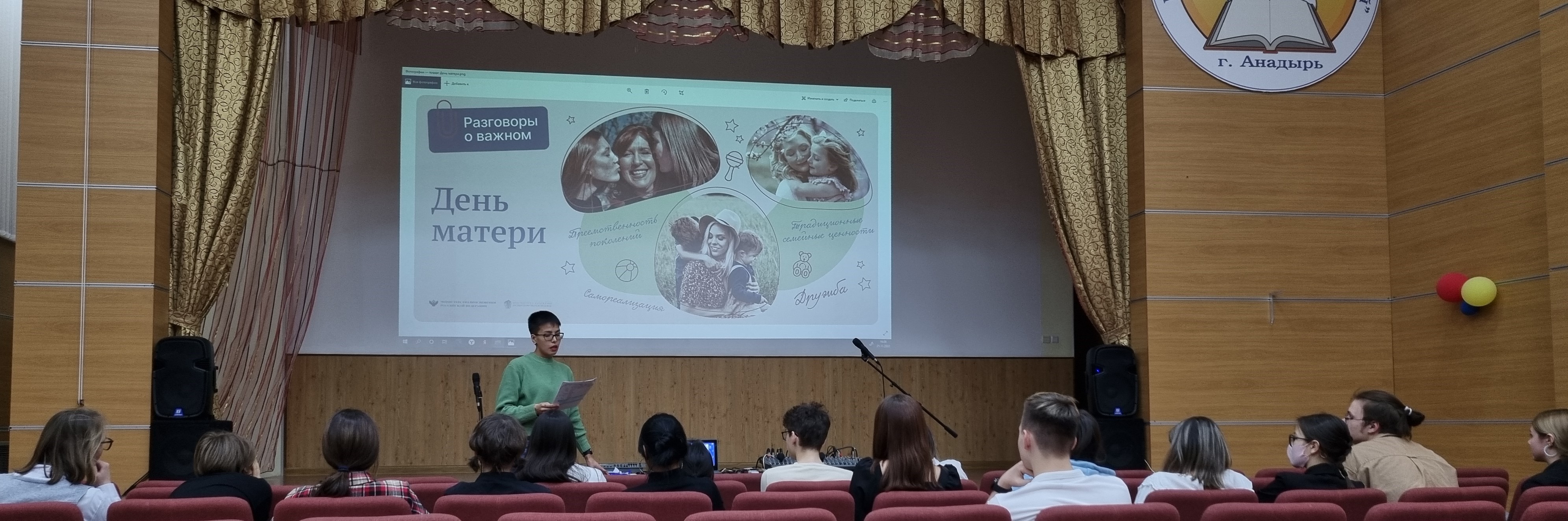 21 ноября 2022 года в актовом зале Чукотского окружного профильного лицея прошел очередной урок из цикла «Разговоры о важном» на тему «День матери» для обучающихся 8-х и 11-х классов (81 человек). Цель - формирование бережного отношения к женщине-матери, уважения к материнскому труду и к многодетным матерям России.