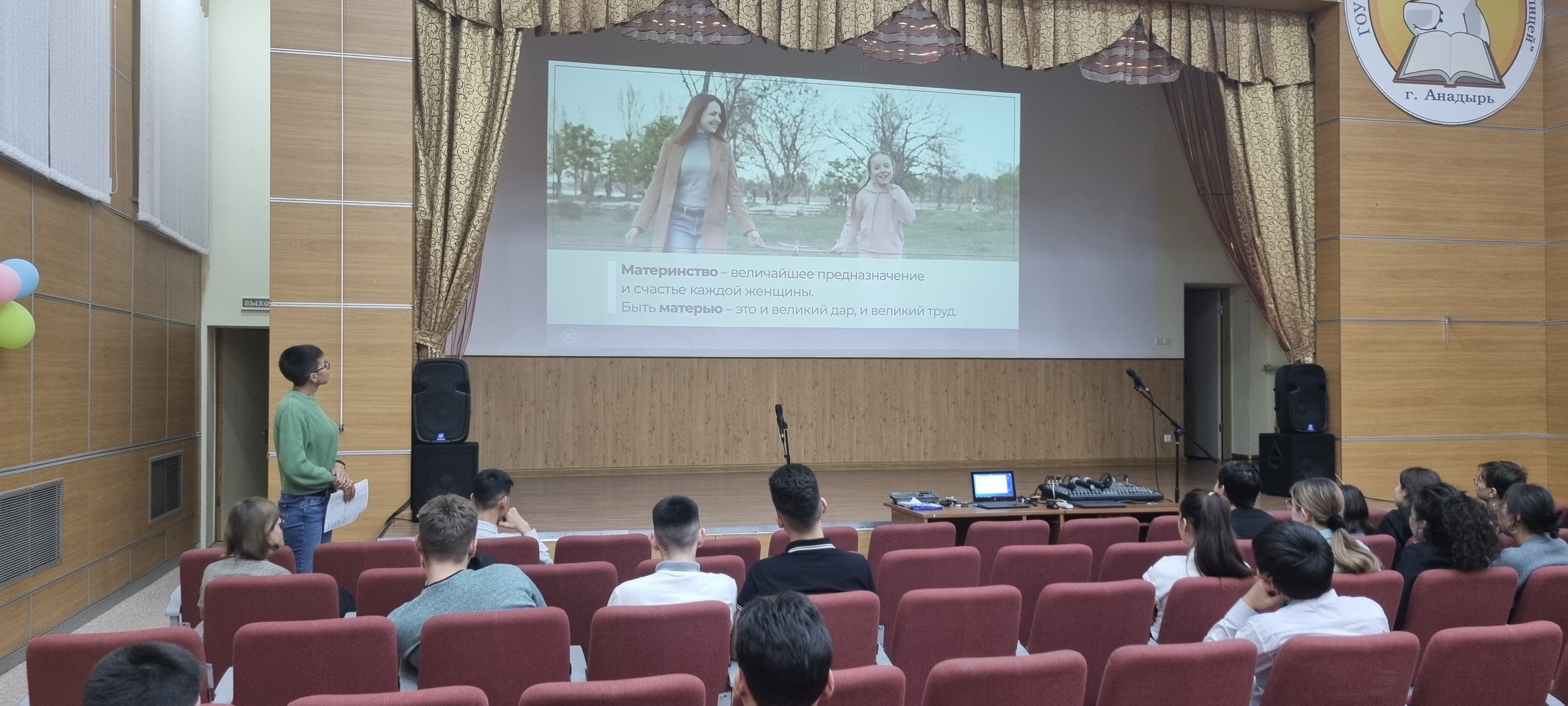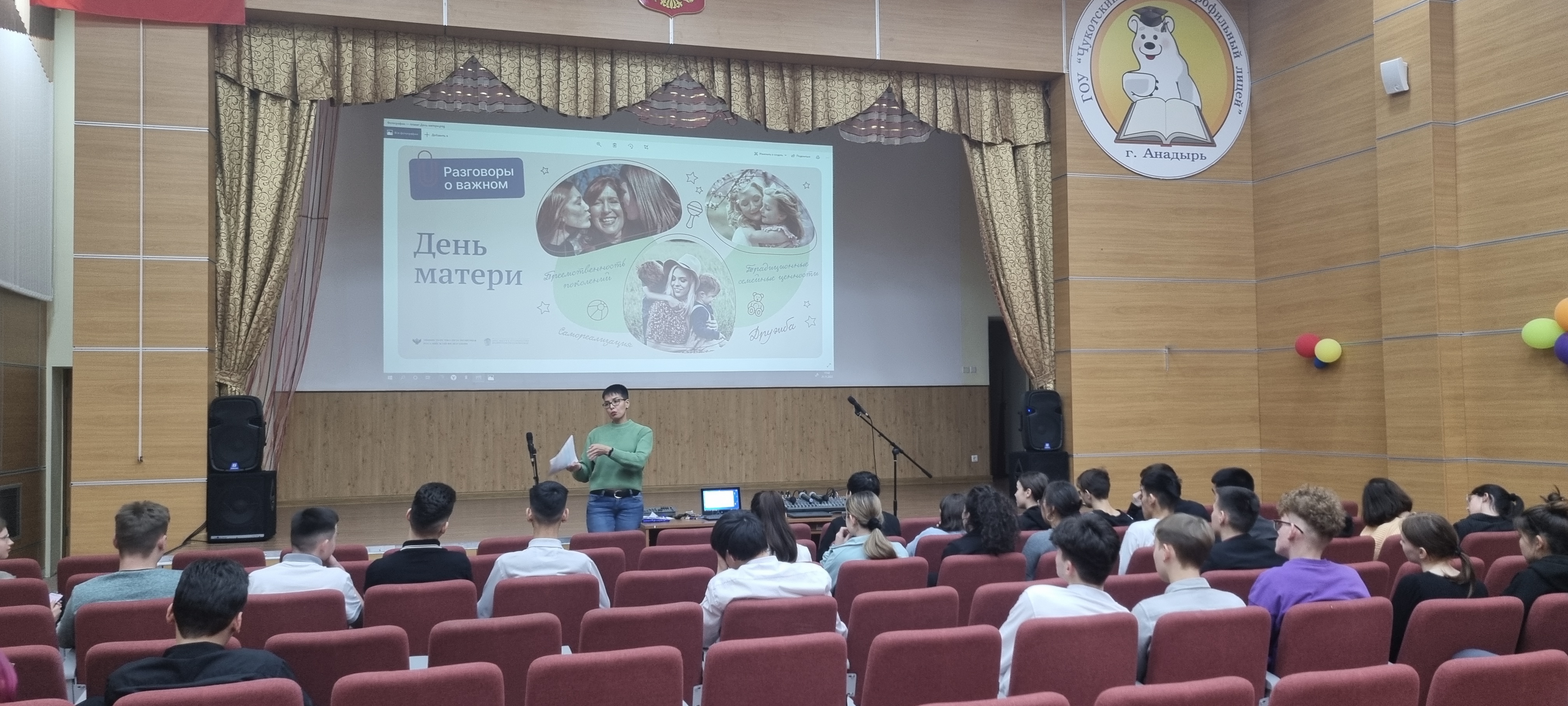 21 ноября 2022 года в актовом зале Чукотского окружного профильного лицея прошел очередной урок из цикла «Разговоры о важном» на тему «День матери» для обучающихся 8-х и 11-х классов (81 человек). Цель - формирование бережного отношения к женщине-матери, уважения к материнскому труду и к многодетным матерям России.